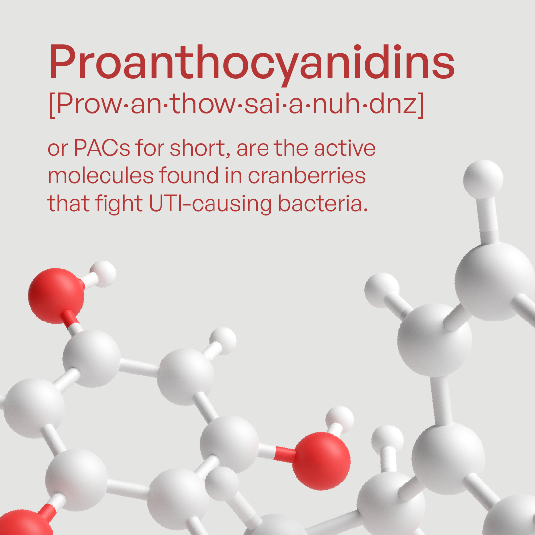 or PACs for short, are the active molecules found in cranberries that fight UTI-causing bacteria