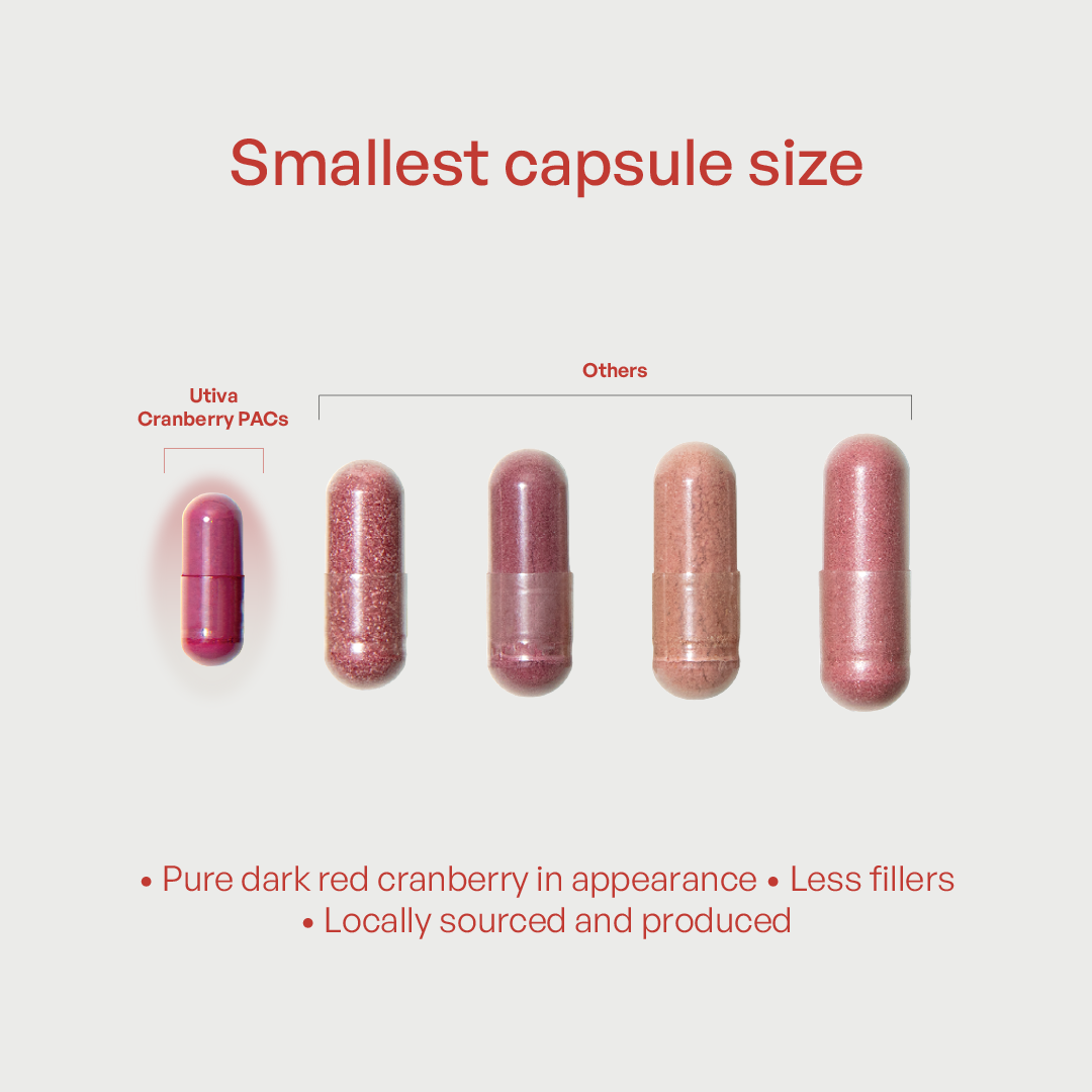 This is the exact clinically proven dose needed to be effective in preventing bacteria from sticking to the bladder. And the precise amount that is meticulously extracted and contained in every single Utiva Cranberry PACs capsule.