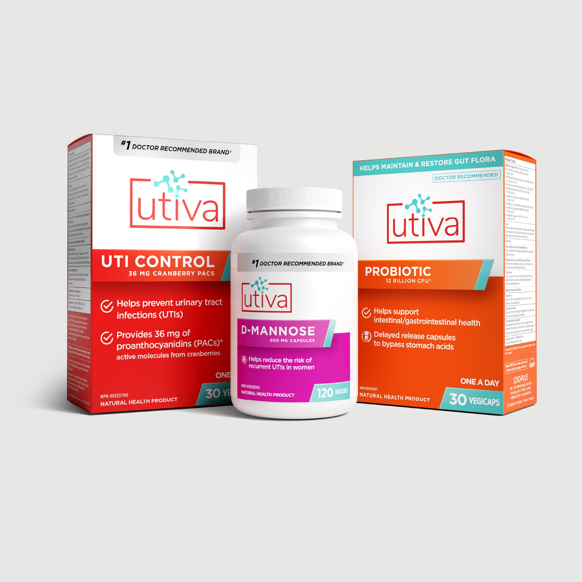 The triple action ultimate prevention bundle including Utiva UTI Control, D-Mannose and Probiotic.